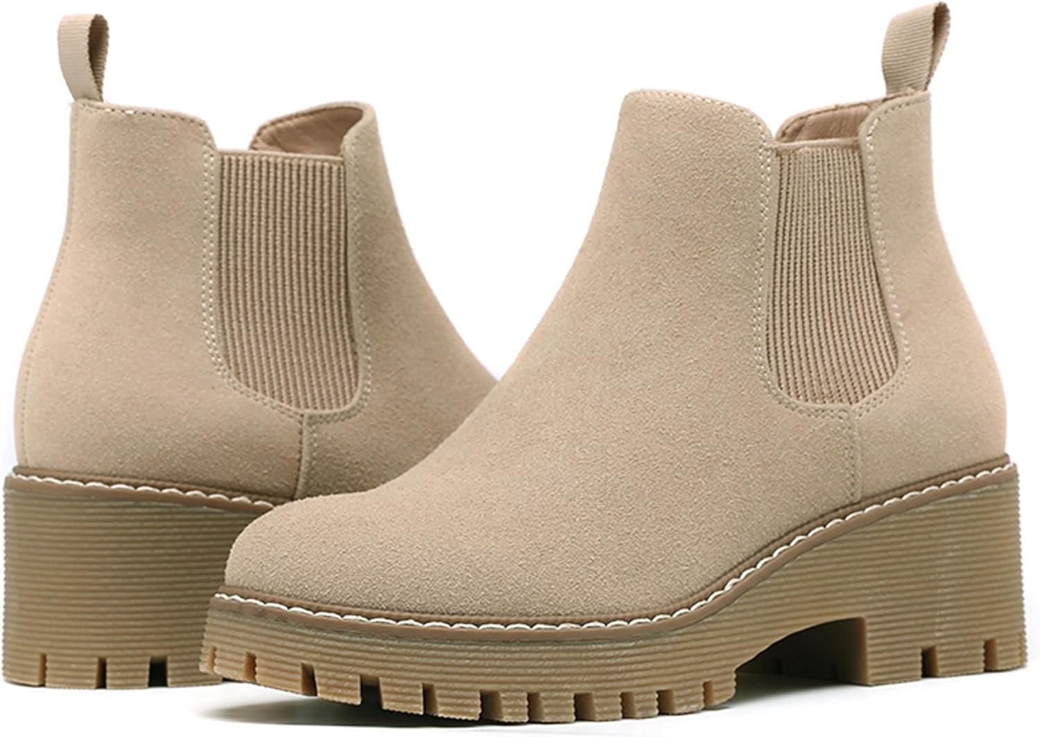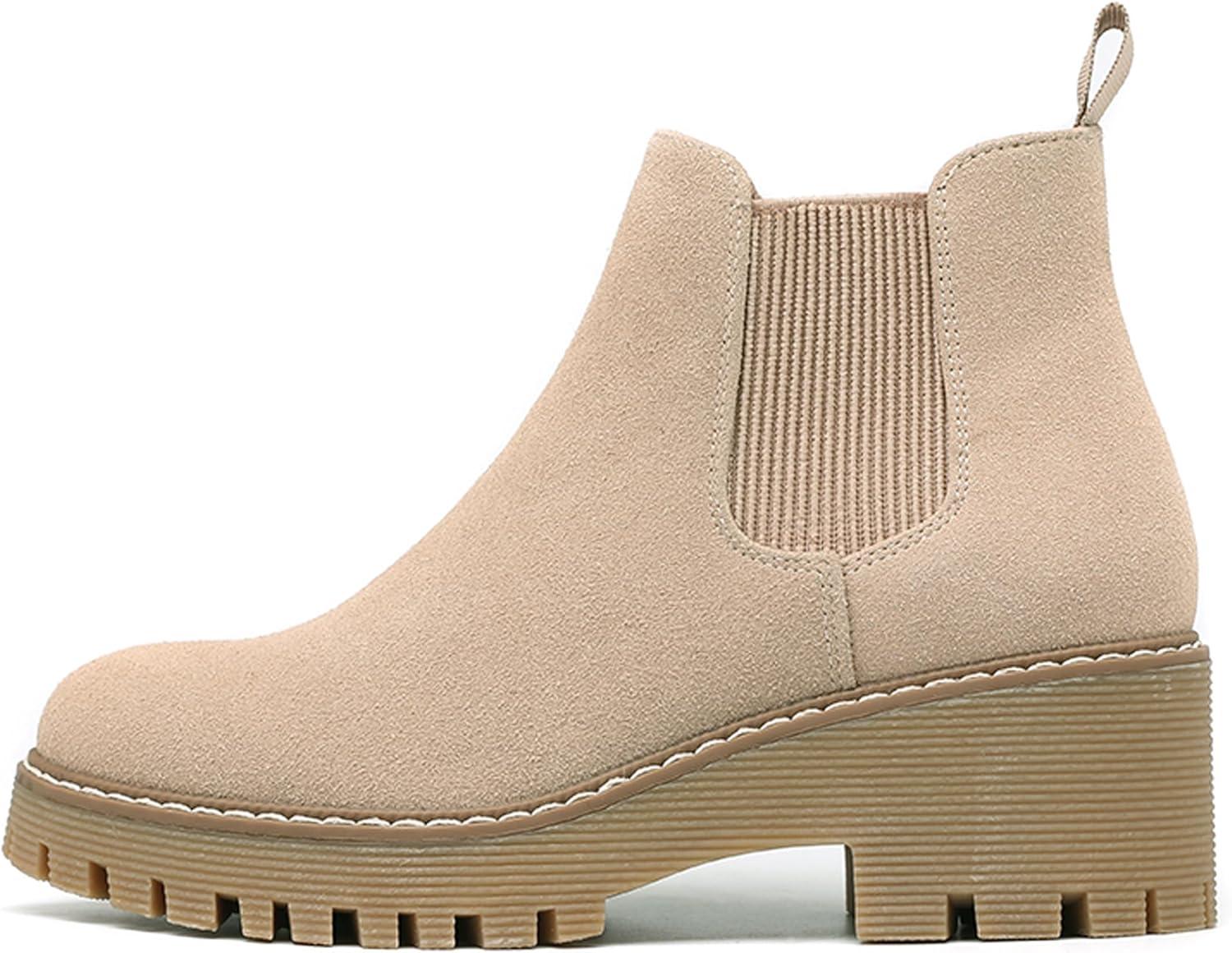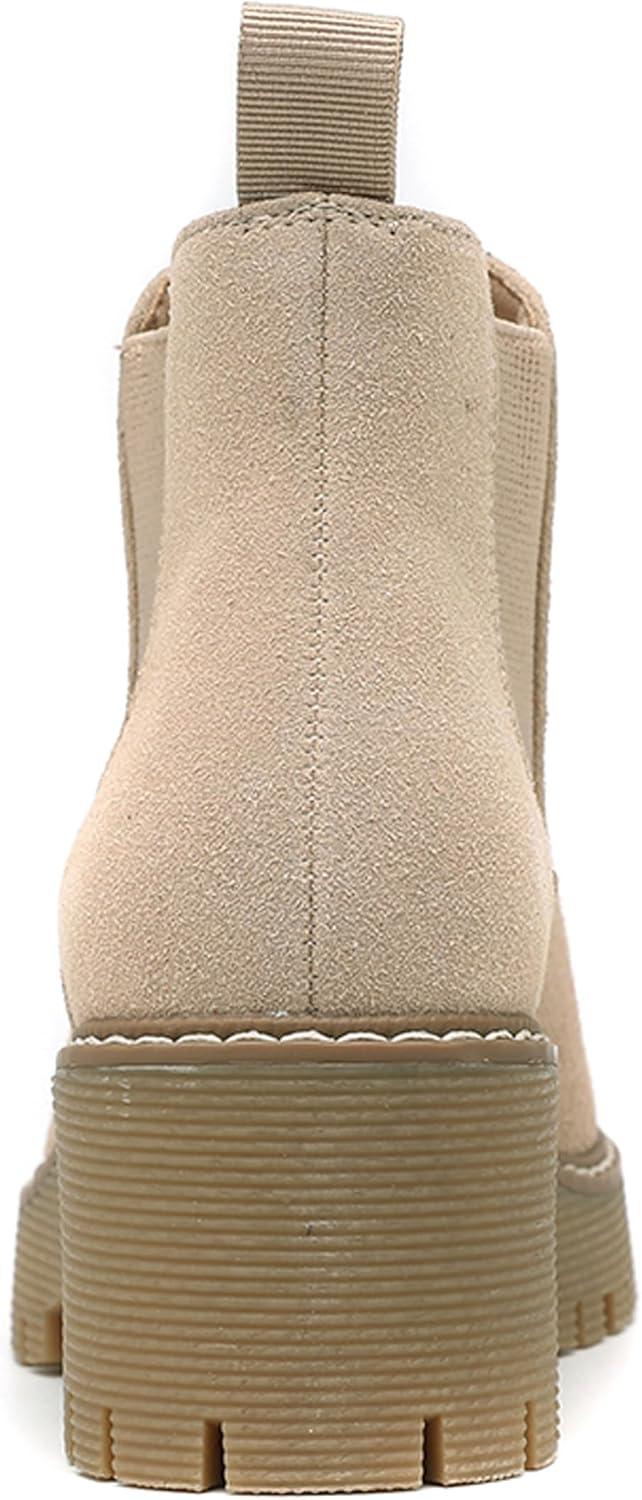 DECARSDZ Womens Chunky Platform Chelsea Boot With Elastic Low Wedge Heel Slip On For Fall Work Suede Leather Classic Style Ankle Boots Women(Nude)